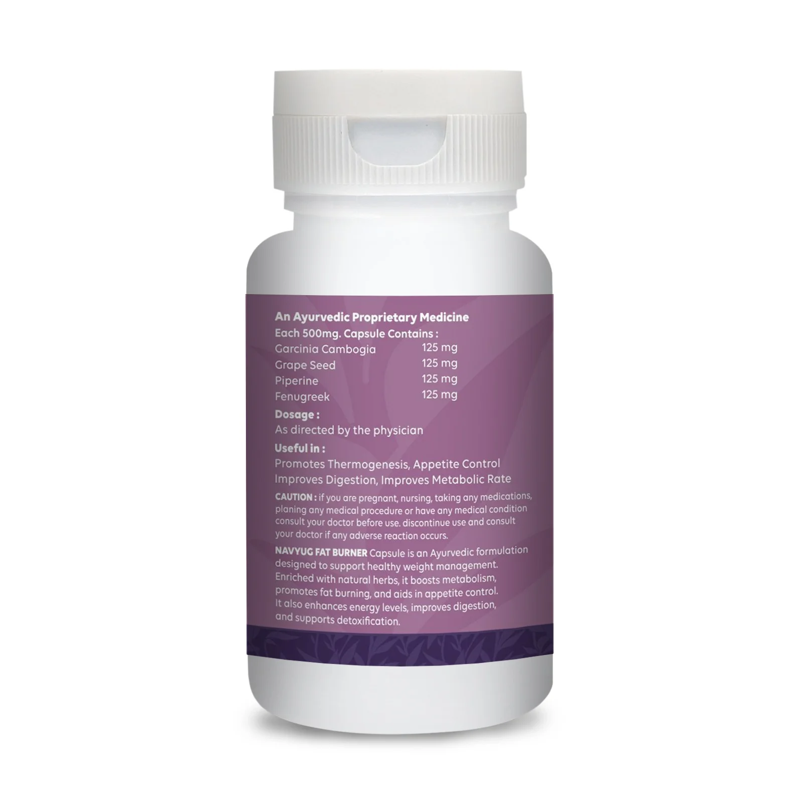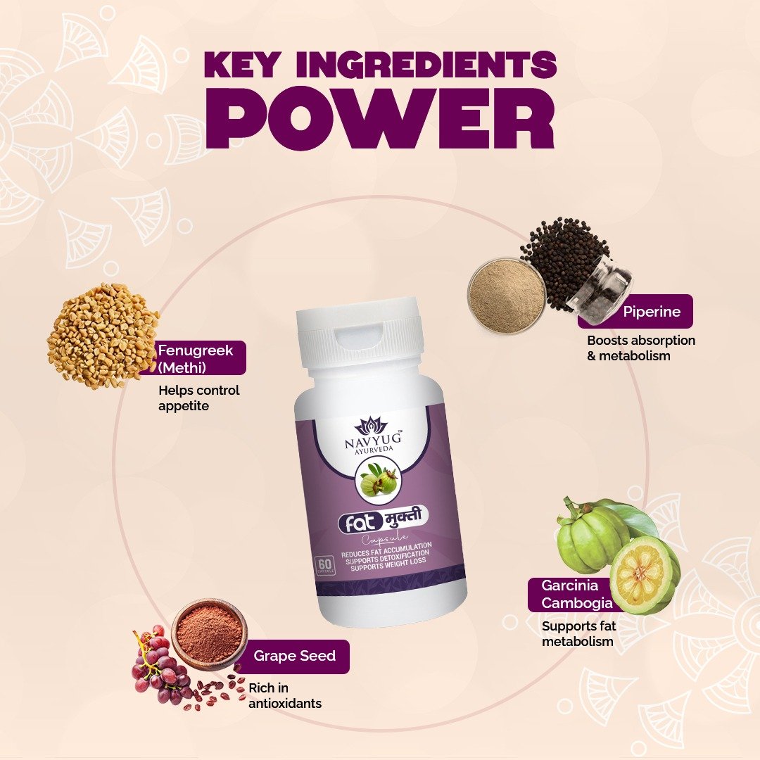 Fat Mukti Capsules by Navyug Ayurveda are a powerful Ayurvedic weight loss supplement designed for natural fat reduction and detoxification. Enriched with Garcinia Cambogia, Grape Seed, Piperine, and Fenugreek, this formula helps reduce fat accumulation, boost metabolism, and support healthy weight management.