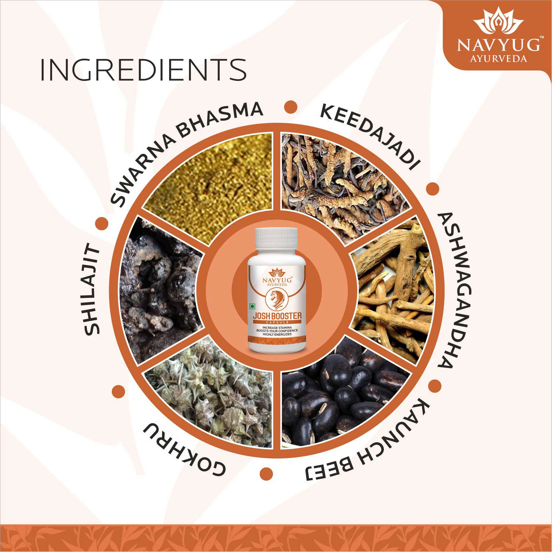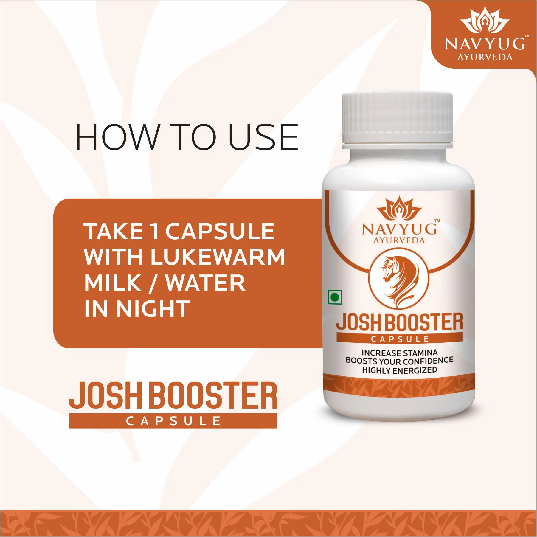 Navyug Ayurveda Josh Booster Capsule is formulated to enhance strength, stamina, and overall energy levels. It helps fight weakness, reduce stress, improve mood, and support healthy testosterone levels.