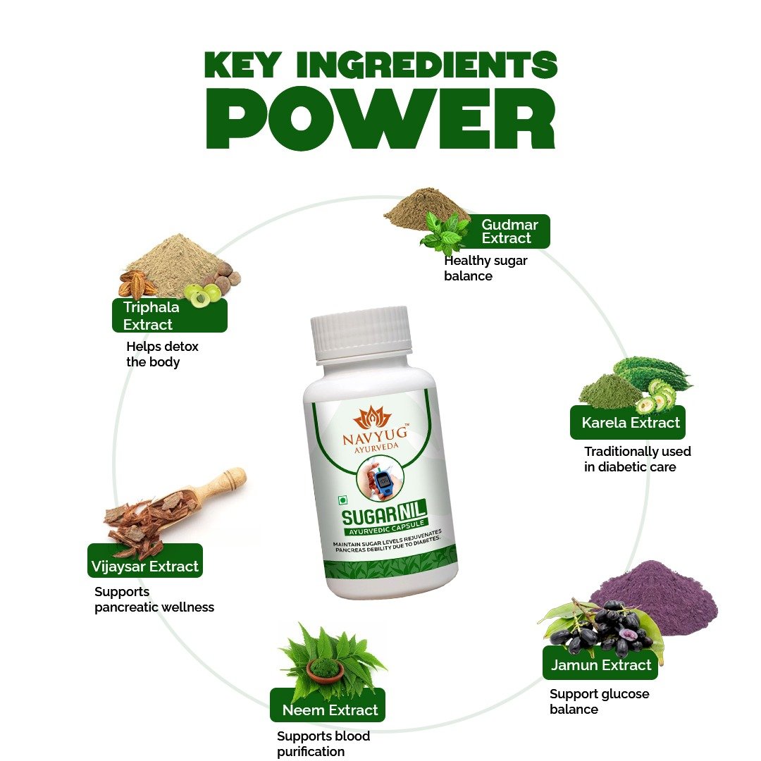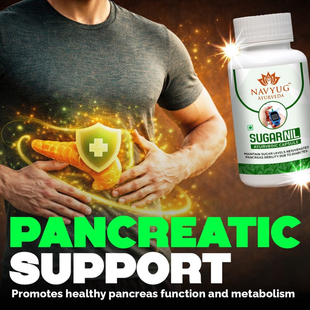 Navyug Ayurveda Sugar Nil is an Ayurvedic capsule designed to support healthy blood sugar management naturally. It helps maintain balanced glucose levels, supports pancreatic function, improves metabolism, and promotes overall wellness.